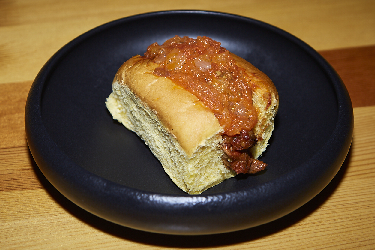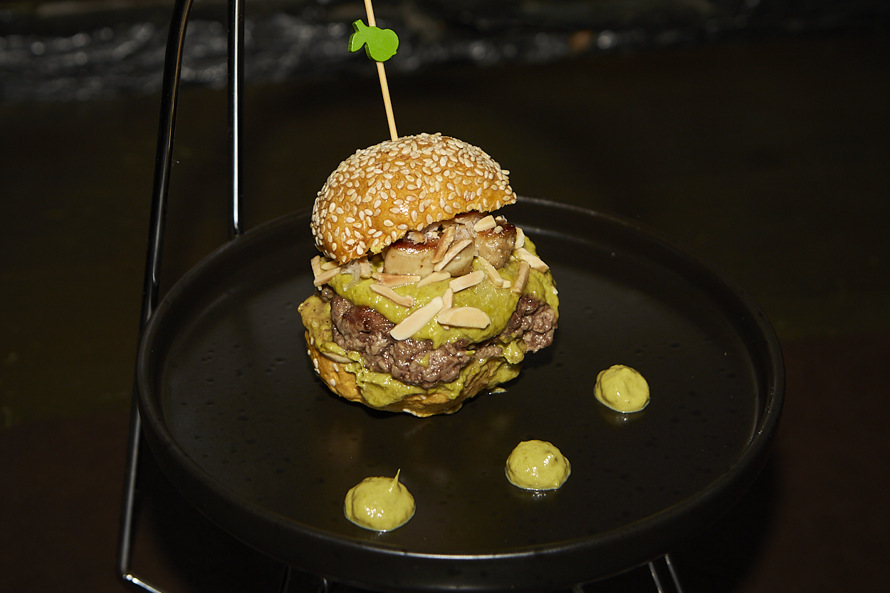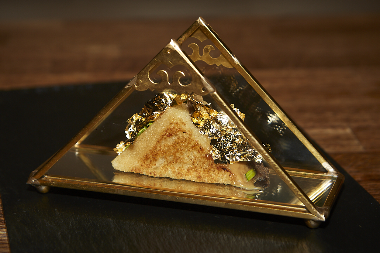 Tostada de pan brioche con carne de ternasco, crema de boniato y esferificaciones de ajo y aceite.