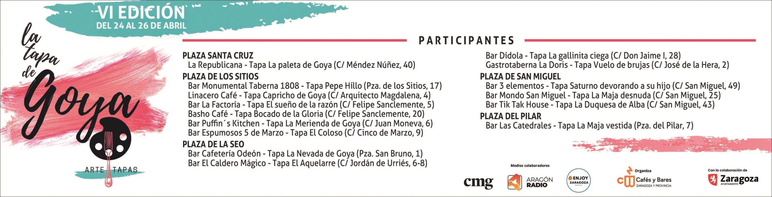 La sexta edición de La Ruta de la Tapa de Goya es una iniciativa de la Asociación de Cafés y Bares de Zaragoza, con la participación de 15 establecimientos hosteleros ubicados en zonas de la ciudad vinculadas a Francisco de Goya. Cada uno ofrecerá una tapa inspirada en la vida o la obra del pintor.