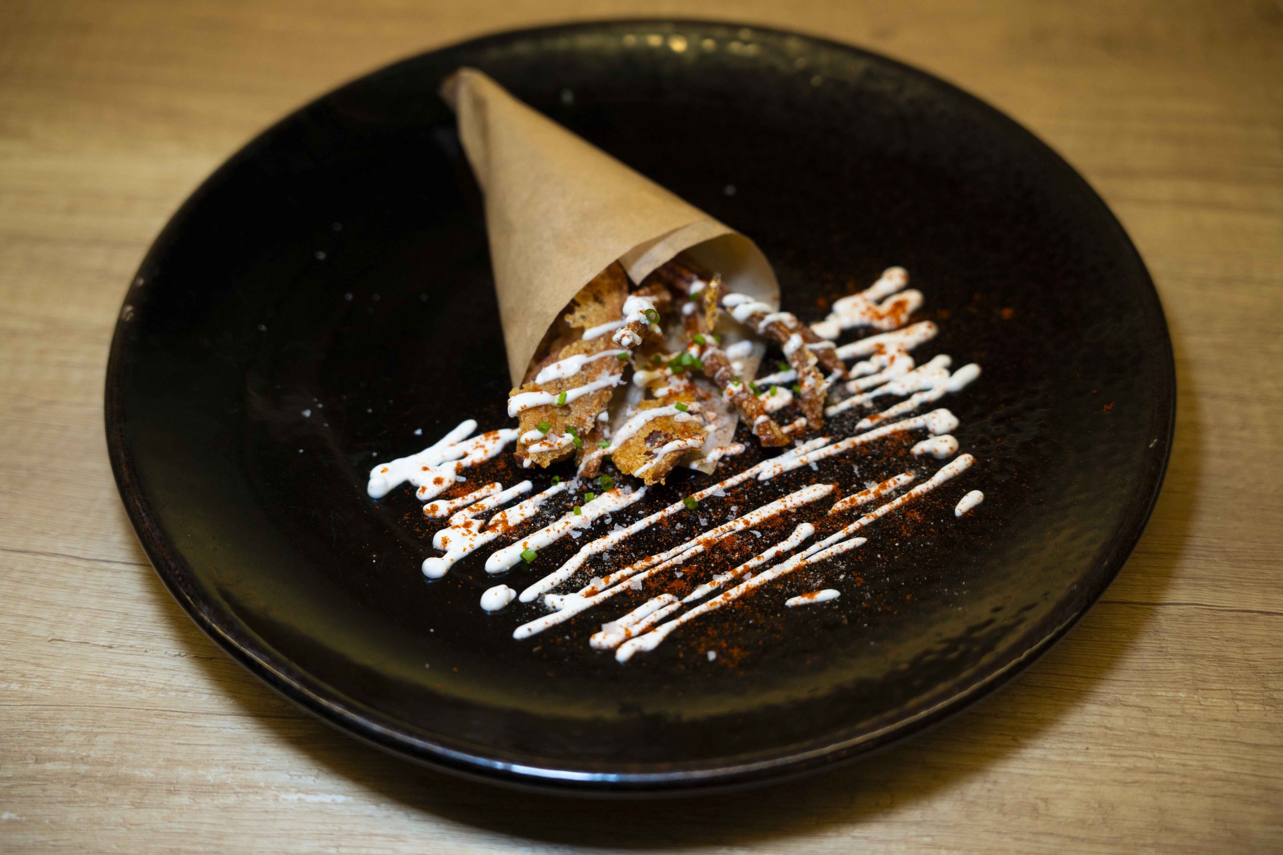 Cucurucho de oreja crujiente con salsa alionesa y pimentón.